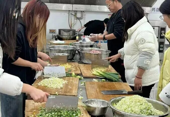 恰逢小雪飘洒,校园银装素裹,室内却暖意融融。活动开始前,学院已精心准备好新鲜的猪肉、羊肉、蔬菜等食材。师生携手完成备料、调味等工作,调配出猪肉白菜与羊肉大葱两种馅料。