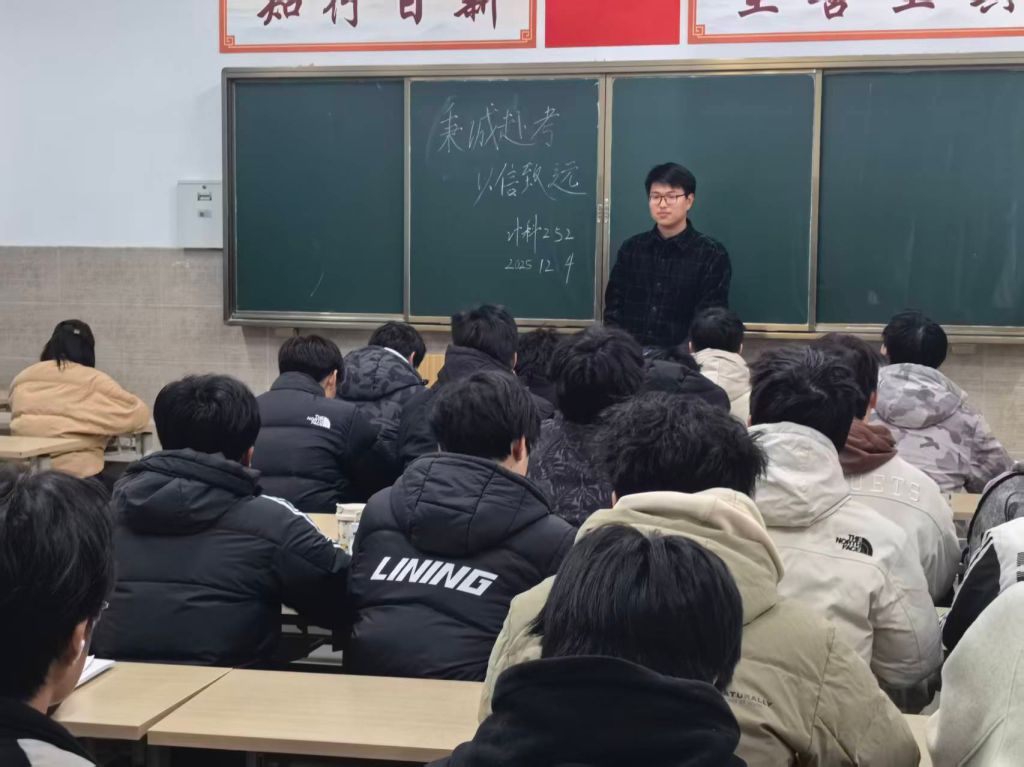 计科252班团支书则依据学生手册,带领大家共同学习了学校期末考试相关规章制度,通过典型违纪案例剖析,深入解读了作弊行为的严重后果,引导学生充分认识到诚信是立身之本,考试作弊不仅违背道德,更会影响个人成长发展,进一步强化了大家的纪律意识和规矩意识。随后,结合日常专业学习特点,进入备考经验及交流环节,分享了知识点梳理、代码实操练习、错题整理复盘等实用备考方法,鼓励大家合理规划复习时间,针对薄弱科目组建学习小组互帮互助,形成 “比学赶超” 的良好氛围。学生们积极互动,主动交流备考困惑,在思想碰撞中明确了复习重点和备考方向。