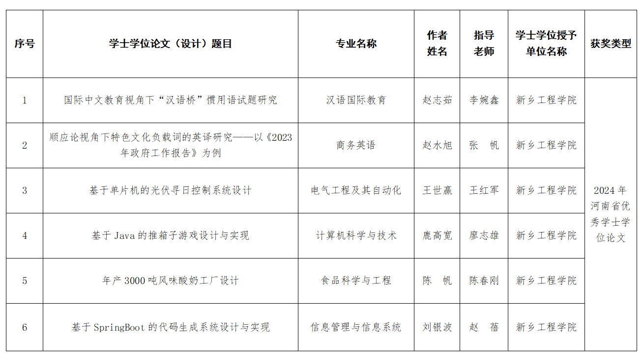 近日,河南省教育厅下发了《关于公布2024 年河南省优秀学位论文评选结果的通知(教研〔2025〕210 号)》文件,我校《国际中文教育视角下“汉语桥”惯用语试题研究》等6篇学位论文荣获河南省优秀论文称号。本次获奖的论文涵盖多个学科领域,选题前沿,研究方法科学,体现了学生扎实的专业基础、独立的科研能力和勇于探索的创新精神。