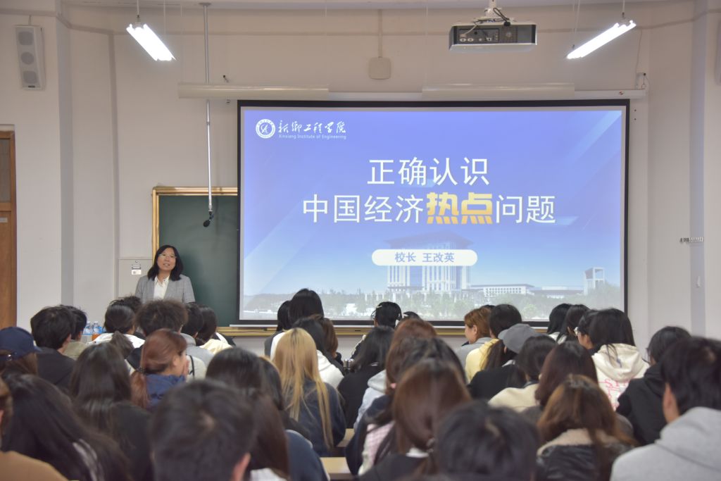 王改英以“正确认识中国经济热点问题”为主题,从“我国应对外部冲击的底气何在”切入,结合当前中国经济发展实际,系统阐释了我国在复杂环境中攻坚克难、稳步前行的实践路径,引导学生深刻感受中国经济的潜力与韧性,鼓励大家树立直面挑战、勇毅前行的信念。授课中,她进一步分析了民营经济面临的困难与挑战,阐明其作为推进中国式现代化生力军的重要作用,帮助学生认清自身肩负的时代责任与成长方向,激励大家以实践锤炼创新思维、提升创新能力。最后,王改英寄语新时代大学生,要摒弃“旁观者”心态,以“参与者”姿态躬身入局,夯实专业基础、拓宽知识视野,积极参与社会实践,积累真实经验,树立正确价值观,以坚定毅力将理想转化为行动,书写无愧于时代的青春篇章。