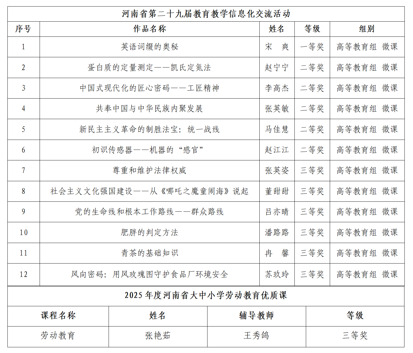 近日,河南省教育厅公布了两项教育教学评选结果。在河南省第二十九届教育教学信息化交流活动评选中,我校共荣获一等奖1项、二等奖5项、三等奖6项。在2025年度河南省大中小学劳动教育优质课评选中,我校教师张艳茹的《劳动教育》课程获三等奖。