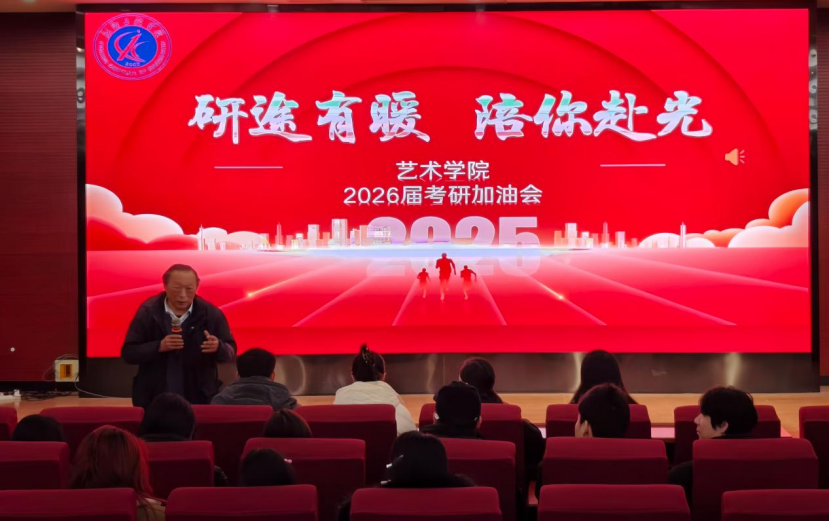 为助力考研学子迎战冲刺阶段的斗志,传递学院的深切关怀与专业支持,近日,艺术学院在学院楼报告厅开展“研途有暖·陪你赴光”2026届考研加油会。学院院长张建伟、党委副书记王永刚、办公室主任刘西会、团委书记陈玄、毕业生辅导员与考研学子齐聚一堂,以艺术人的温度与陪伴,为奋斗在最后关头的学子们注入信心与力量。