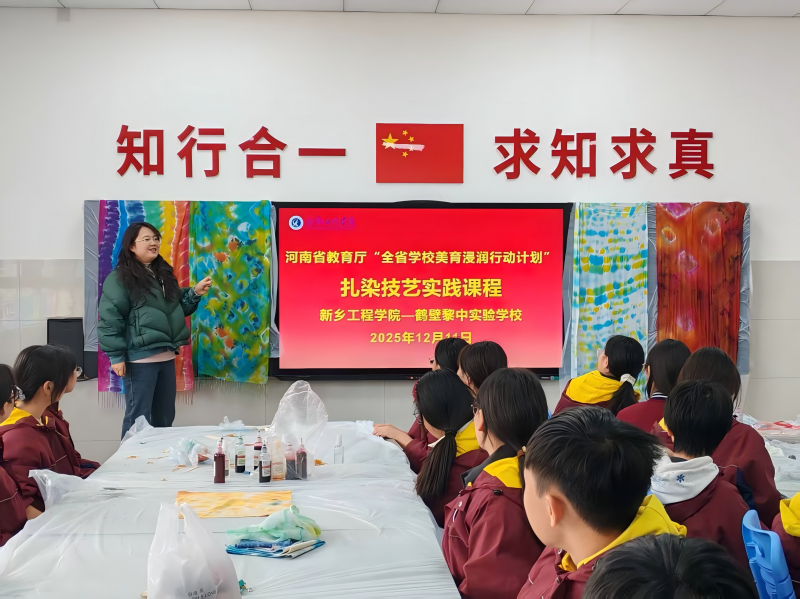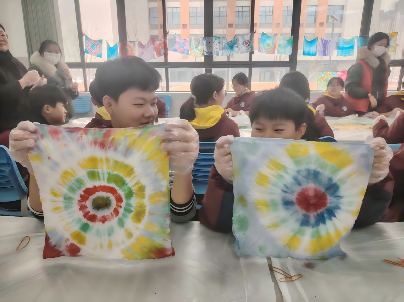 课程实施过程中,团队注重理论与实践相结合,系统讲授扎染技艺的历史渊源与审美价值,并指导学生完成从设计、捆扎到染色、固色的完整创作流程。与此同时,除了本次美育实践教学之外,还协助黎阳中学正式建立了“扎染艺术”兴趣小组,配备了基础工具材料,制定了活动方案与教学计划,为学生掌握美术特长、提升审美能力奠定了基础。