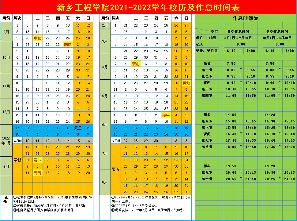 新乡工程学院2021-2022学年校历及作息时间表