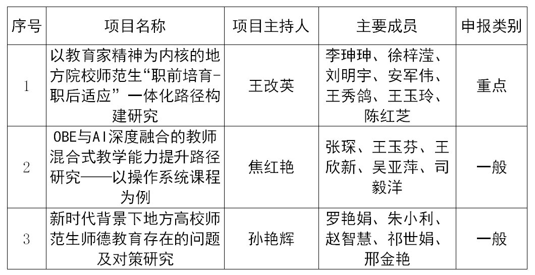 近日,河南省教育厅发布了《关于做好2025年教师教育课程改革研究项目结项和2026年项目申报工作的通知》。按照通知要求,经过学院申报、材料评审、综合评议等程序,我校拟推荐以下研究项目课题进行申报: