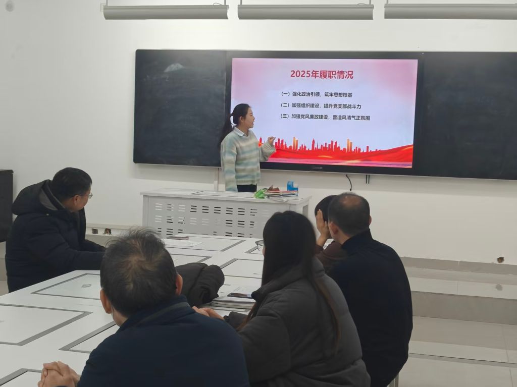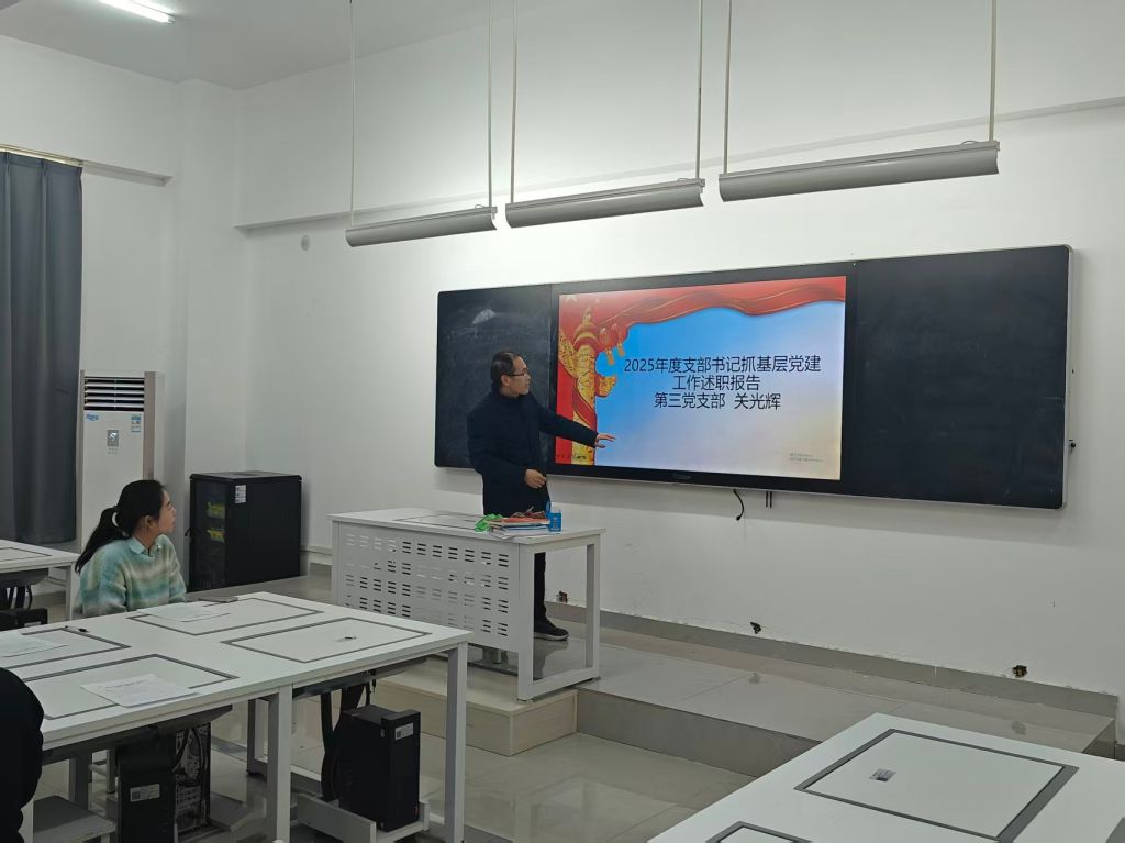 为全面检验党支部年度工作成效,压实党建工作责任,2026年1月12日我院在B3-313教室召开党支部年终述职考核会。会议现场,学院教工党支部书记赵蓓,学生第一党支部书记蒋彬、学生第二党支部书记赵润、学生第三党支部书记关光辉、学生第五党支部书记徐瑞林依次作述职报告。院党委副书记张震主持会议。