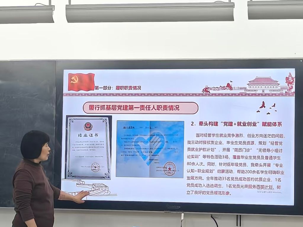 会议现场,各学生党支部书记依次走上讲台,围绕年度党建工作重点任务落实情况展开述职。汇报中,大家既实事求是总结了一年来在支部建设、党员教育管理、党建与业务融合等方面取得的实绩实效,也直面工作中存在的短板与不足,同时结合支部实际提出了下一步的改进思路和工作计划。