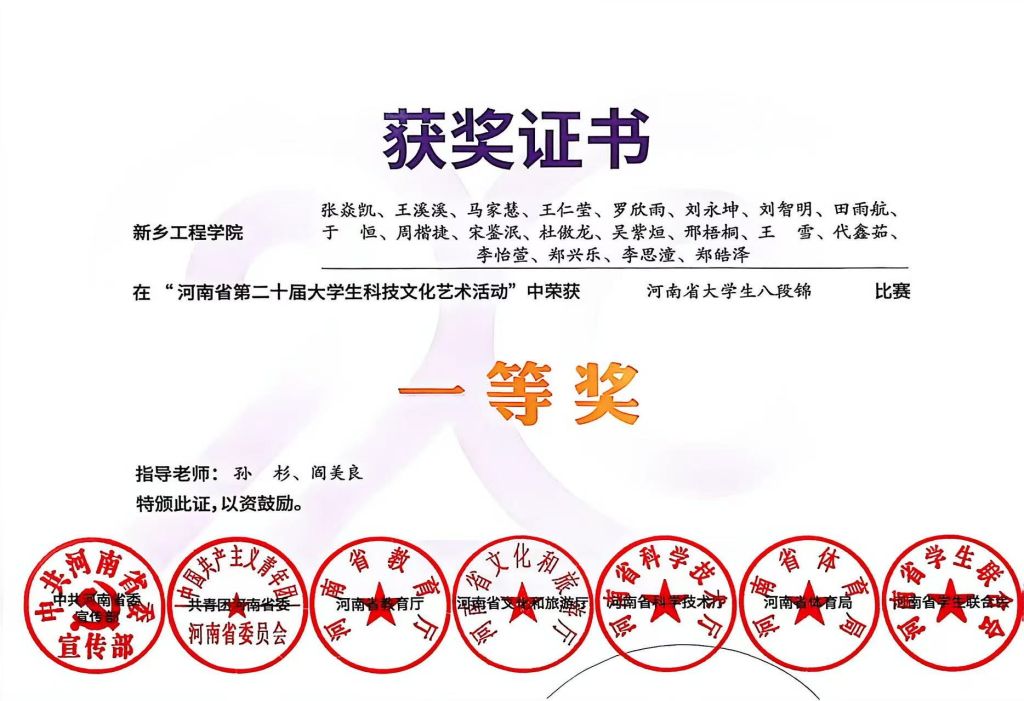 近日,由省委宣传部、团省委、教育厅等部门主办的河南省第二十届大学生科技文化艺术节八段锦比赛成绩公布。我校武术队在体育学院孙杉老师和校团委阎美良老师的指导下,凭借扎实的功底、规范的动作和良好的精神风貌,在激烈角逐中脱颖而出,斩获一等奖。