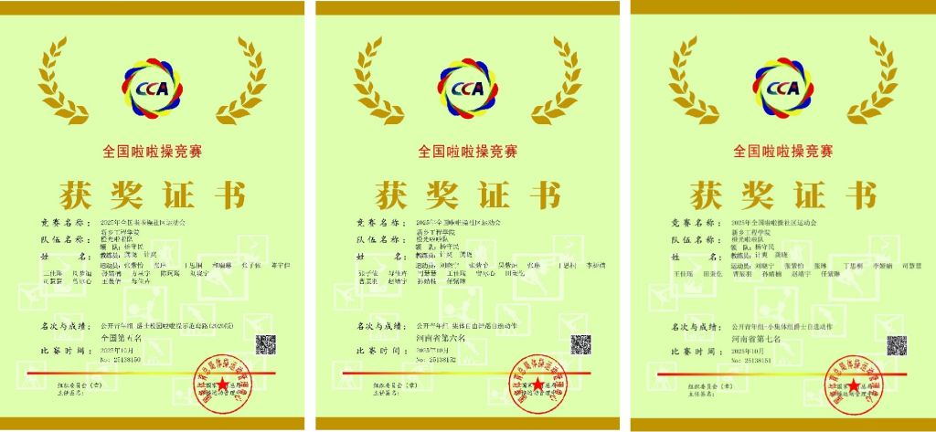 11.2025年10月我校啦啦操队参加国家体育总局体操运动管理中心、中国蹦床与技巧协会主办的2025年全国啦啦操社区运动会,斩获公开青年组-爵士校园啦啦操示范套路全国第5名、公开青年组-集体自由舞蹈自选动作河南省第6名、公开青年组-小集体组爵士自选动作河南省第7名。