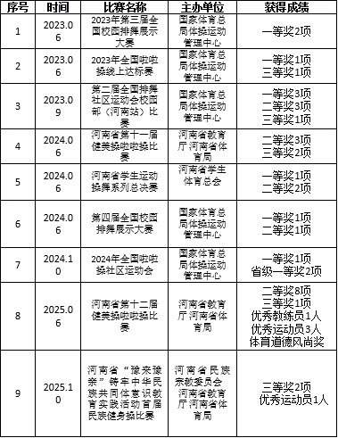 河南省第十二届学生健美操啦啦操比赛自由舞蹈自选动作二等奖、排舞规定动作二等奖、大集体花球规定动作二等奖、