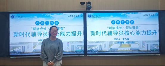 为进一步提升辅导员队伍的专业素养和育人能力,夯实思政育人工作的硬本领,11月5日下午,我校教师发展中心在教学楼3-510智慧教室举办了“赋能成长,领航青春——新时代辅导员核心能力提升”专题工作坊活动。本次活动由心理健康教育与指导中心主任、国家二级心理咨询师王九霞主讲,各学院青年辅导员代表参加。