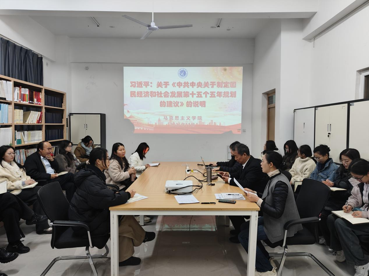 为深入学习领会习近平总书记关于“十五五”规划建议的重要论述,准确把握国家未来发展方略,进一步增强马克思主义理论工作者的政治自觉和使命担当,11月19日,马克思主义学院在教学楼2-206会议室召开专题理论学习会,集中学习关于习近平总书记《中共中央关于制定国民经济和社会发展第十五个五年规划的建议》的说明。此次会议由马克思主义学院副书记田萌主持,全体教师参会。