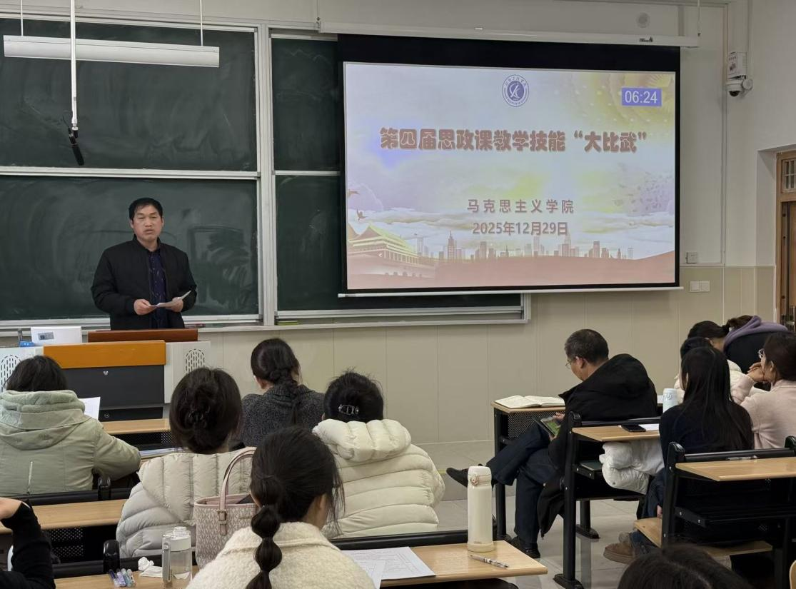 为深入推进思政课教学改革创新,锤炼教师教学基本功,提升思政课教师专业素养和教学能力,切实增强思政课堂的理论性与亲和力,马克思主义学院于2025年12月29日上午,在3号教学楼105教室成功举办第四届思政课教学技能“大比武” 活动。学院全体教师参与本次活动,学院各教研室主任担任评委并作点评总结,八名思政课教师同台竞技、各展所长,带来了一场精彩纷呈的教学技能比拼盛宴。