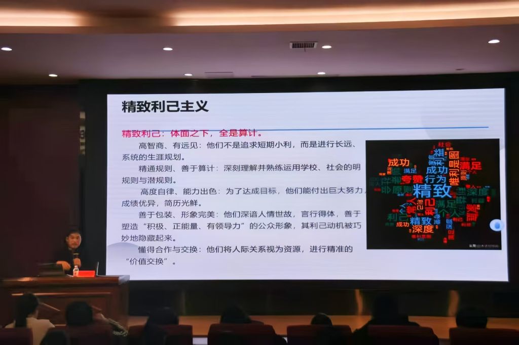 讲座聚焦“精致利己主义”、“消费主义”、“历史虚无主义”等当代大学生所面临的思想挑战,展开了多维度、深层次的研讨交流。董家强通过生动的案例,系统剖析了各类思潮在校园中的表现形态,揭示其对个人发展和社会信任的潜在危害。针对不良思潮带来的冲击和价值取向的滑坡,董家强提出了“四步识别法”与“五项修炼法”的应对策略,帮助学员们辨别错误思潮的本质特征和应对各类思潮的具体措施。在学习过程中,学员们深刻的认识到错误思潮对青年理想信念的侵蚀性,以及正确价值观的重要引领作用。讲座最后,董家强寄语广大学员们,要做“思想清醒的擎炬者”,在纷繁复杂的思潮中坚守初心、明辨是非、锐意进取,将个人理想融入国家发展大局,以实际行动诠释新时代中国青年的责任与担当。