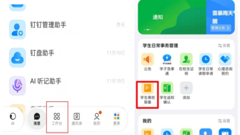 电脑端打开“钉钉”.exe--点击“工作台” 点击“学生离校报备”按照所需内容填写后提交。