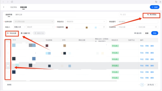 点击“历史记录” 点击“导出全部”可全部导出/点击姓名前的复选框可选择导出/点击“更多筛选”可根据筛选条件选择导出。