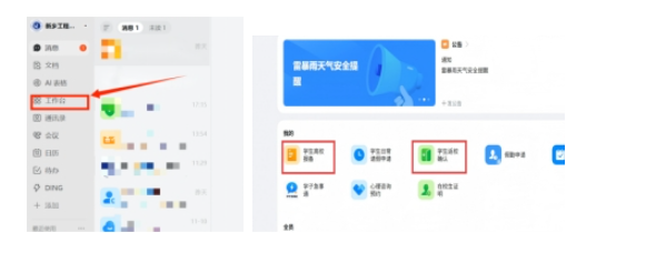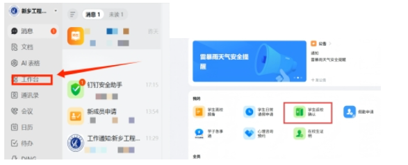 电脑端打开“钉钉”.exe--点击“工作台” 点击“学生返校确认”按照所需内容填写后提交。